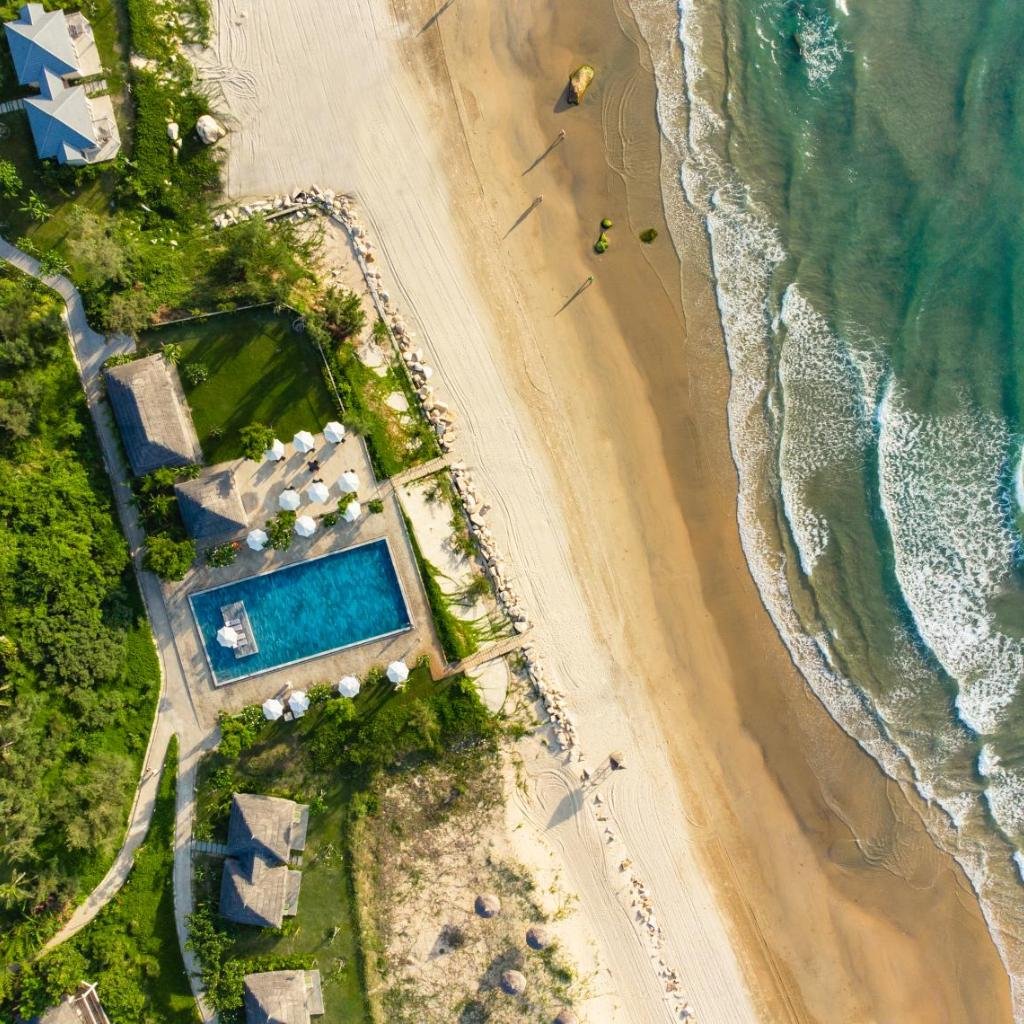 Resort được thiết kế với khu vườn xanh mát và bãi biển riêng, tạo nên không gian nghỉ dưỡng khá riêng tư. Hồ bơi ngoài trời là điểm nhấn cho những ai muốn thư giãn mà không phải ra biển. Khoảng cách từ resort đến sân bay Phù Cát khoảng 23 km, thuận tiện cho việc di chuyển.