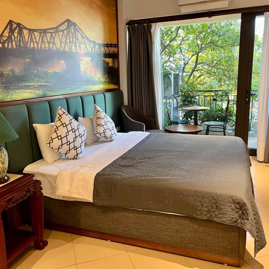 Một số phòng có view nhìn ra thành phố, mang đến góc nhìn thú vị về đời sống Hà Nội. Mỗi phòng đều có bàn làm việc, ga trải giường và khăn tắm sạch sẽ.