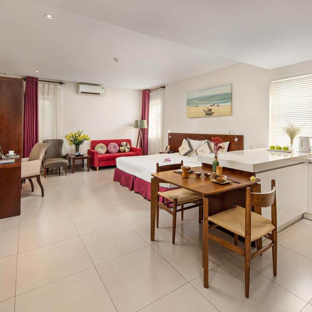 Điểm đáng chú ý là tất cả các phòng đều có máy pha cà phê, giúp khách có thể thưởng thức đồ uống ngay tại phòng. Một số phòng còn được thiết kế với bếp nhỏ, bao gồm lò nướng, lò vi sóng và bếp nấu, phù hợp cho khách lưu trú dài ngày hoặc gia đình có nhu cầu tự nấu ăn.