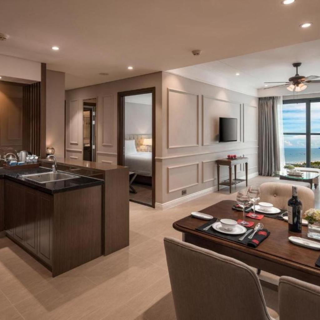 Điểm đặc biệt của căn hộ là ban công và sân hiên với tầm nhìn ra thành phố, mang đến không gian thư giãn lý tưởng để ngắm cảnh. Bếp được trang bị đầy đủ các thiết bị như tủ lạnh, lò nướng, lò vi sóng, minibar, bếp nấu và ấm đun nước, giúp khách có thể tự chuẩn bị bữa ăn theo ý muốn.