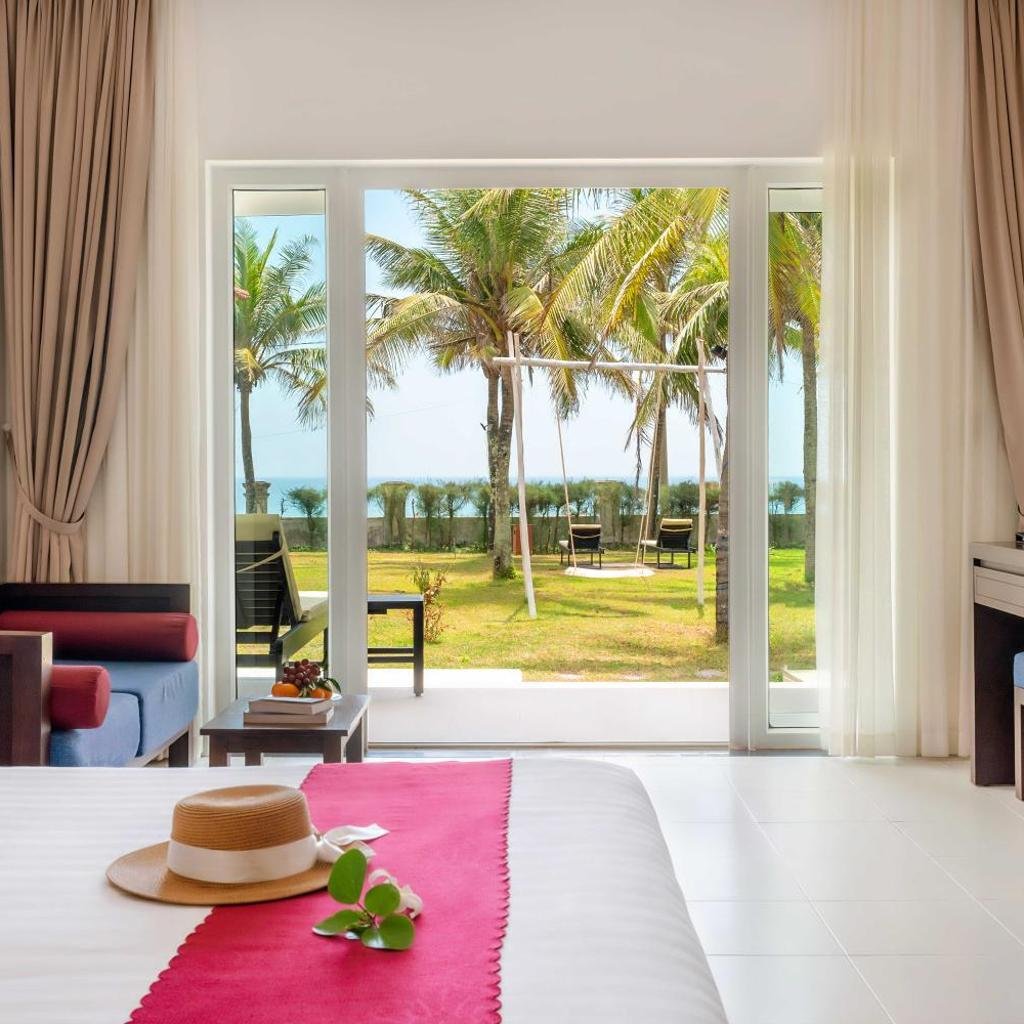 Một số hạng phòng được thiết kế với ban công riêng, có đồ nội thất ngoài trời, mở ra tầm nhìn hướng biển, hồ bơi hoặc khu vườn, phù hợp với nhu cầu thư giãn và ngắm cảnh của du khách.