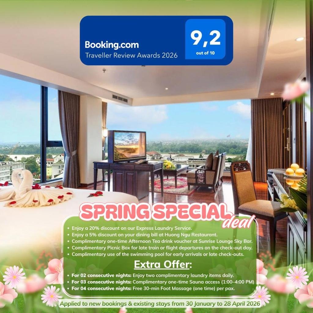 Nhà hàng tại khách sạn phục vụ nhiều món ăn địa phương đặc trưng của Huế cùng với các loại đồ uống đa dạng tại quầy bar. Du khách có nhu cầu đặc biệt về chế độ ăn có thể yêu cầu chuẩn bị các bữa ăn phù hợp. Dịch vụ phục vụ ăn uống tại phòng cũng sẵn có cho những ai muốn dùng bữa riêng tư.
