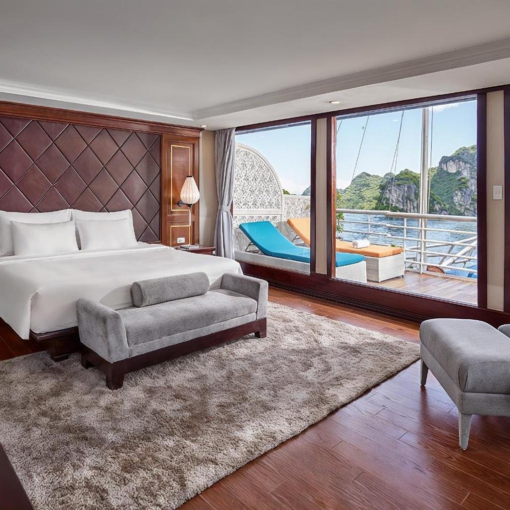 Các phòng khách trên Verdure Lotus Classic Cruise được thiết kế với đầy đủ tiện nghi hiện đại. Mỗi phòng đều có bàn làm việc phục vụ nhu cầu công việc, cùng ban công riêng hướng ra núi để du khách có thể chiêm ngưỡng khung cảnh thiên nhiên. Hệ thống điều hòa được lắp đặt trong tất cả các phòng, kết hợp với tủ quần áo tiện lợi.